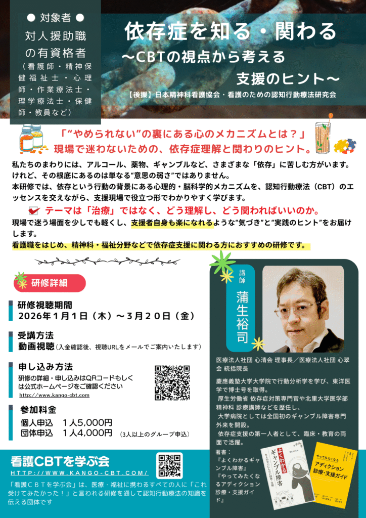 看護職をはじめ、精神科・福祉分野などで依存症支援に関わる方におすすめの研修です。