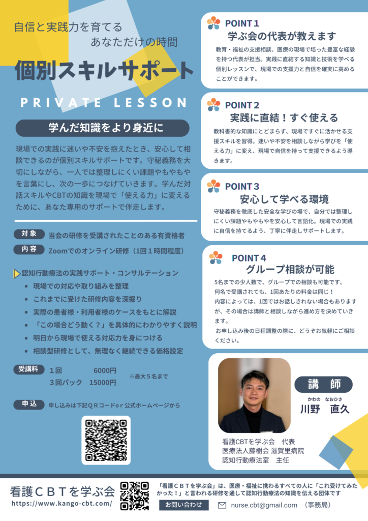 現場での実践に迷いや不安を抱えたとき、安心して相談できるのが個別スキルサポートです。守秘義務を大切にしながら、一人では整理しにくい課題やもやもやを言葉にし、次の一歩につなげていきます。学んだ対話スキルやCBTの知識を現場で「使える力」に変えるために、あなた専用のサポート