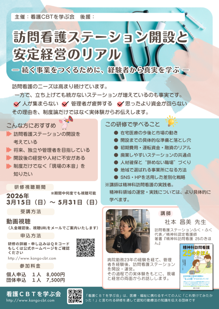 本研修は、訪問看護ステーションの開設から運営までを実体験に基づいて学ぶ、実践型研修です。